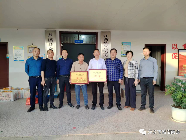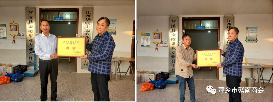 11月29日,冬日暖阳,橙香四溢。萍乡市赣南商会一行驱车到芦溪县为江西华辰生态农业科技发展有限公司董事长魏远忠、江西通友橙业有限公司董事长杜有海授理事牌匾,并观赏脐橙基地。商会会长李先锋,常务副会长赖勇、刘恒,副会长徐天祥,秘书长刘霞,副秘书长谢金香一起参加活动。