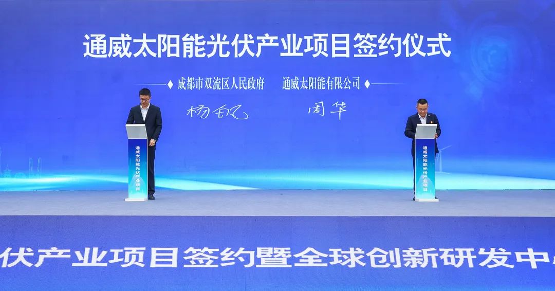 仪式现场,在各级领导、来宾的见证下,双流区委副书记、区长杨钒与通威太阳能总经理周华分别代表双流区政府与通威正式签订太阳能光伏产业项目投资协议。随后,双方代表共同推动启动装置,宣布通威太阳能光伏产业项目及全球创新研发中心项目正式启动。