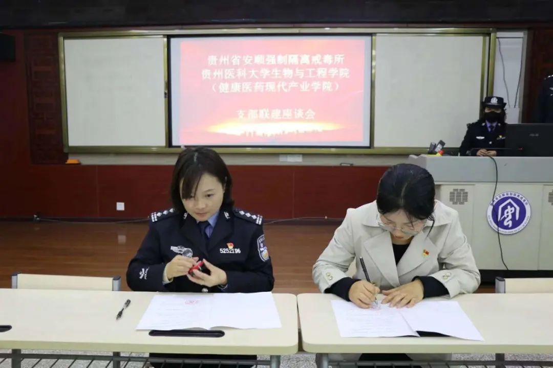 参观学习结束后,本科生党支部与安顺强制隔离戒毒所机关第二党支部签订联建协议,结为共建支部。接下来会共同开展“禁毒宣传进校园”系列活动,通过举办禁毒知识讲座、发放禁毒手册、举办禁毒知识竞赛等方式,继续宣传禁毒知识,筑牢禁毒防线。