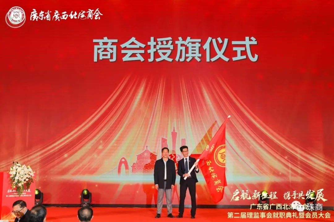 大会举行了授旗仪式,由北海市委统战部常务副部长梁旭向新一届广东省广西北海商会第二届理事会授旗,新当选会长李国敏博士代表商会接受会旗。