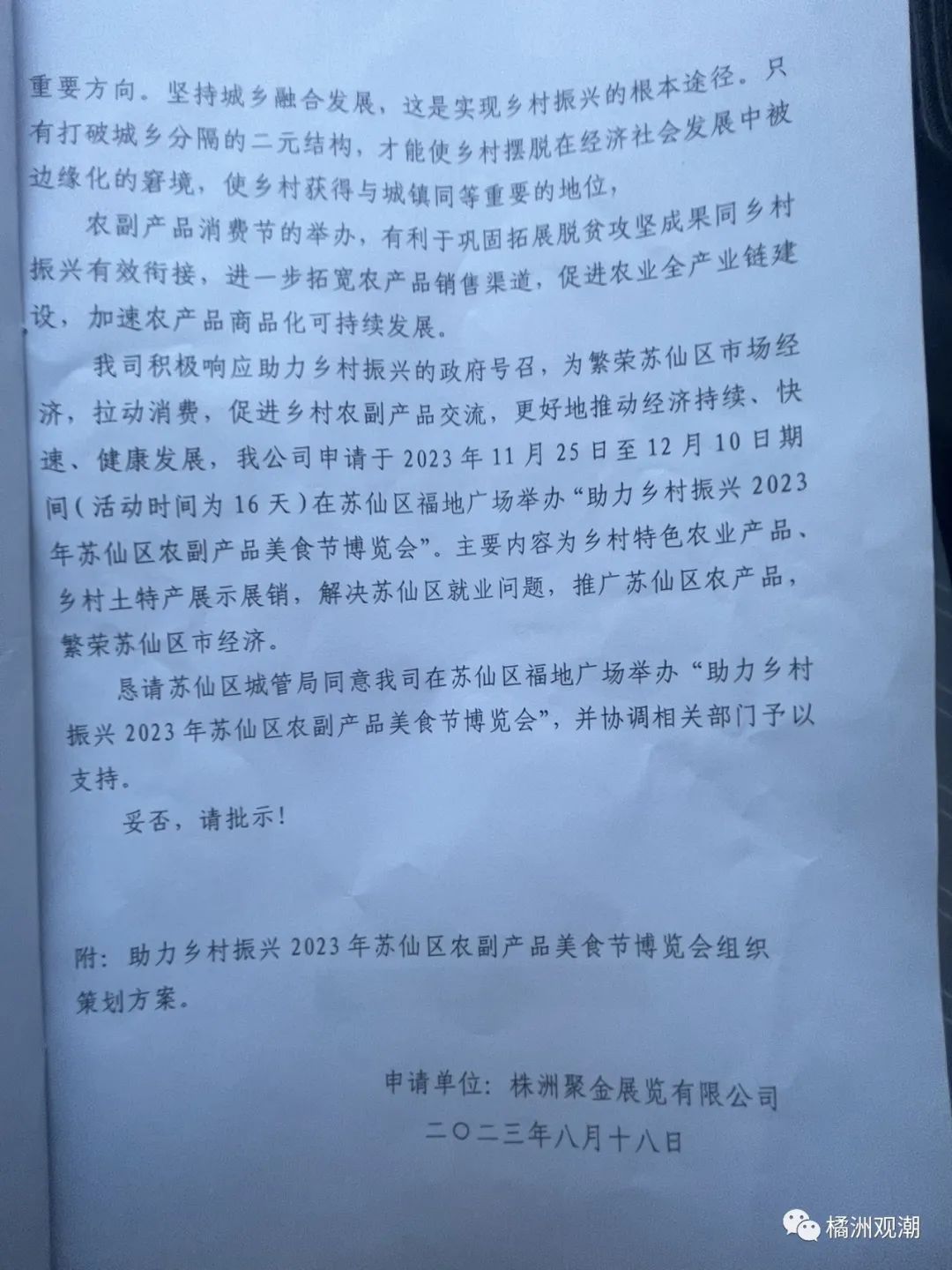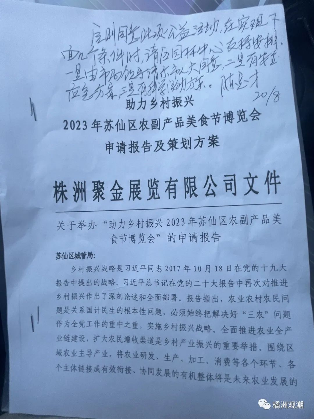 为成功举办本次博览会,8月20日,株洲聚金会展公司找到了广场管理方郴州市人大陈剑秘书长同意及苏仙区城管局陈定才局长批示。