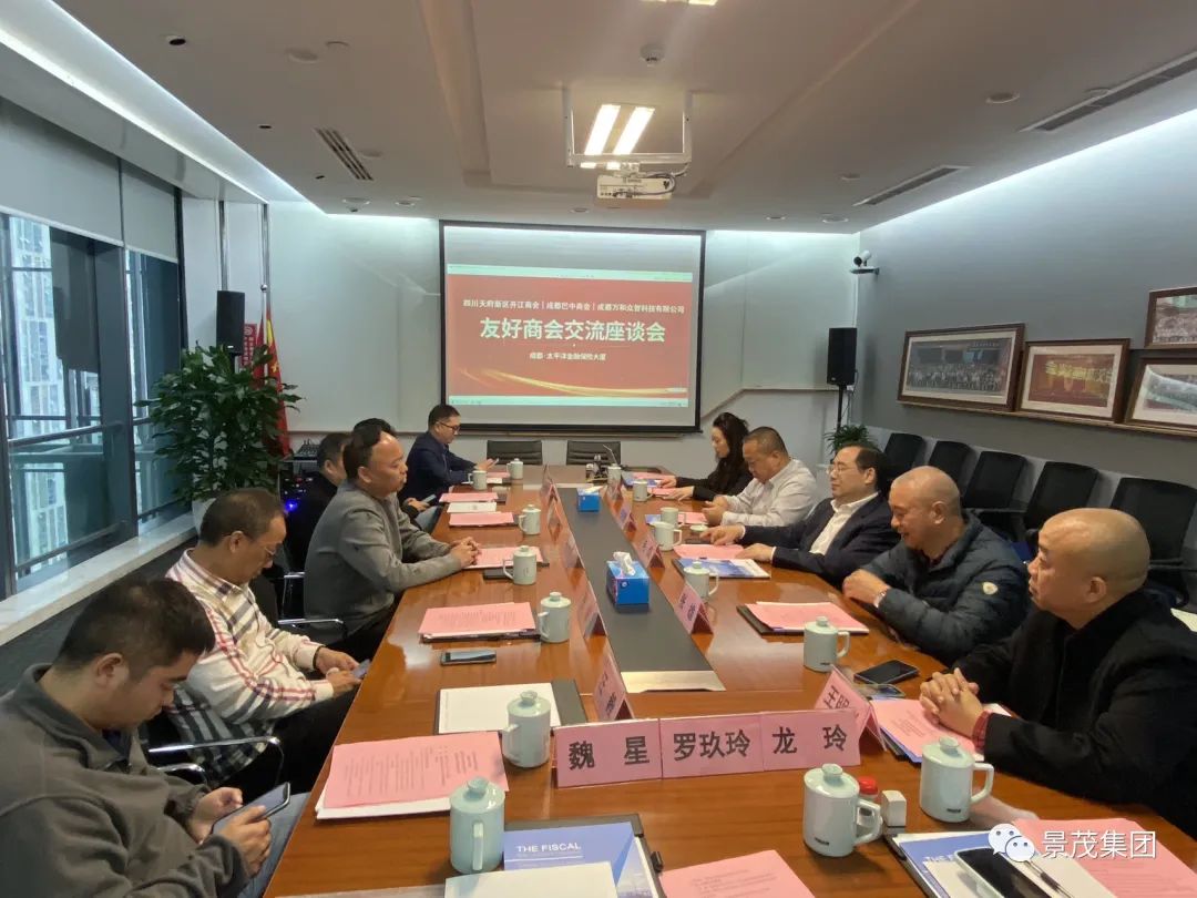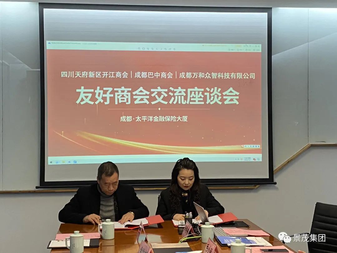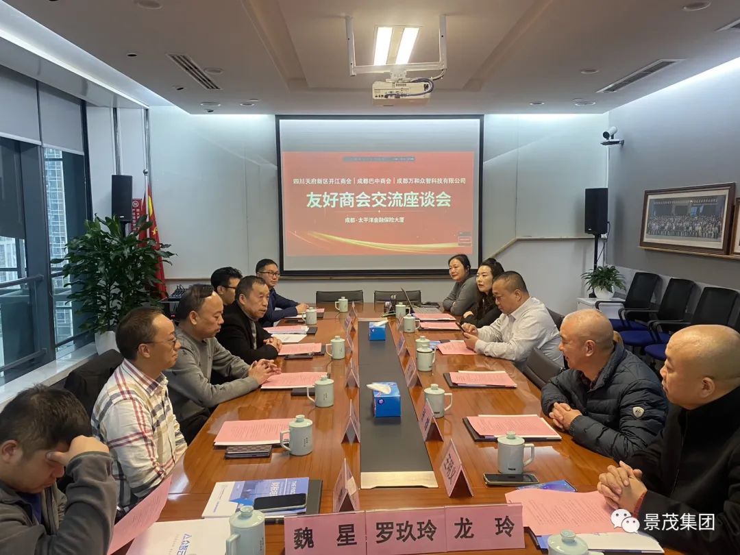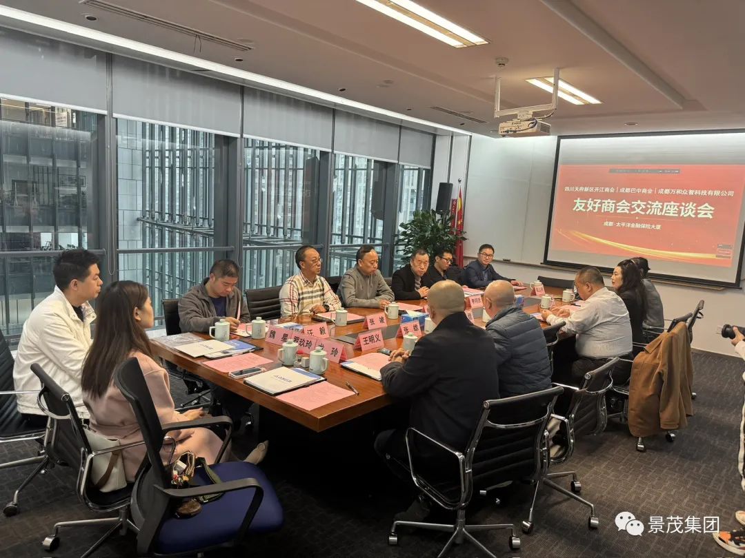 12月1日下午,四川天府新区开江商会、成都巴中商会、成都万和众智科技有限公司友好商会交流座谈会在成都高新区天府三街太平洋金融保险大厦十楼举行,旨在加强商会之间的交流与合作,共同探讨商会、企业发展的新机遇。出席座谈会的有成都巴中商会会长、万和众智财税服务集团董事长毛熠,成都巴中商会秘书长张雄、副秘书长阳洁,成都万和众智科技有限公司总经理毛小燕、营销总监李冬梅,四川天府新区开江商会轮值会长、成都融兴科创产业园管理有限公司董事长张竣,四川天府新区开江商会轮值会长、水井坊锦江体育公园总经理余洪旭,四川天府新区开江商会常务副会长、城投工业(北京)有限公司董事长汪毅,四川天府新区开江商会秘书长李明武以及双方商会人员、公司人员等,景茂集团董事长、四川天府新区开江商会会长熊正宽先生出席本次座谈会。
