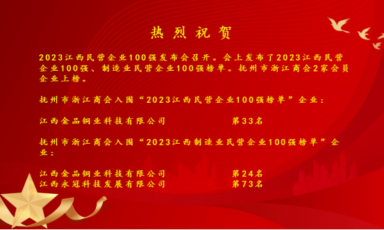 11月3日,2023江西民营企业100强发布会召开。会上发布了2023江西民营企业100强、制造业民营企业100强榜单。热烈祝贺抚州市浙江商会荣誉会长唐俊烈的企业江西金品铜业科技有限公司以排名33位入围“2023江西民营企业100强榜单”。荣誉会长唐俊烈的企业江西金品铜业科技有限公司以排名第24位和常务副会长吕新民的企业江西永冠科技发展有限公司以排名第73位入围“2023江西制造业民营企业100强榜单”。