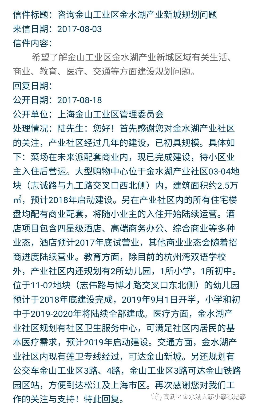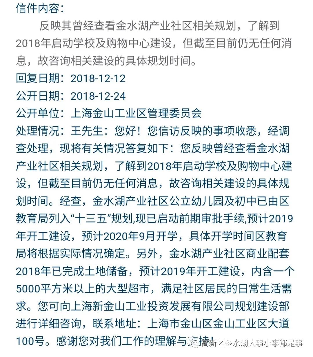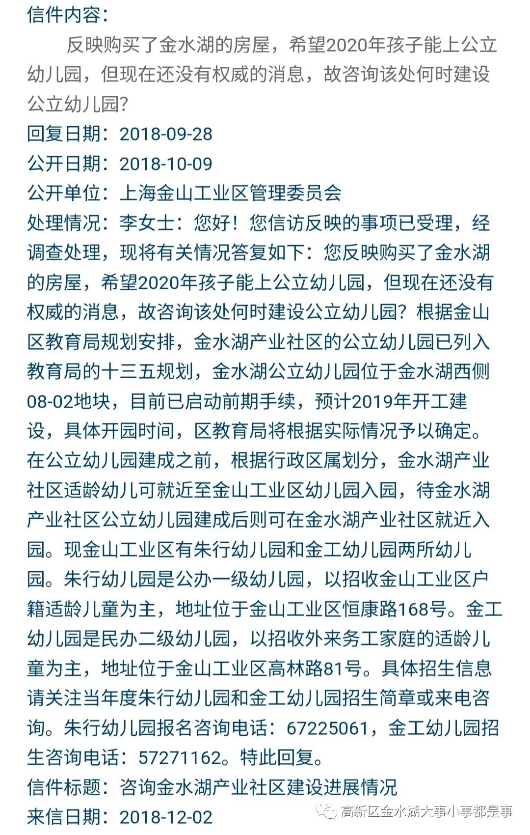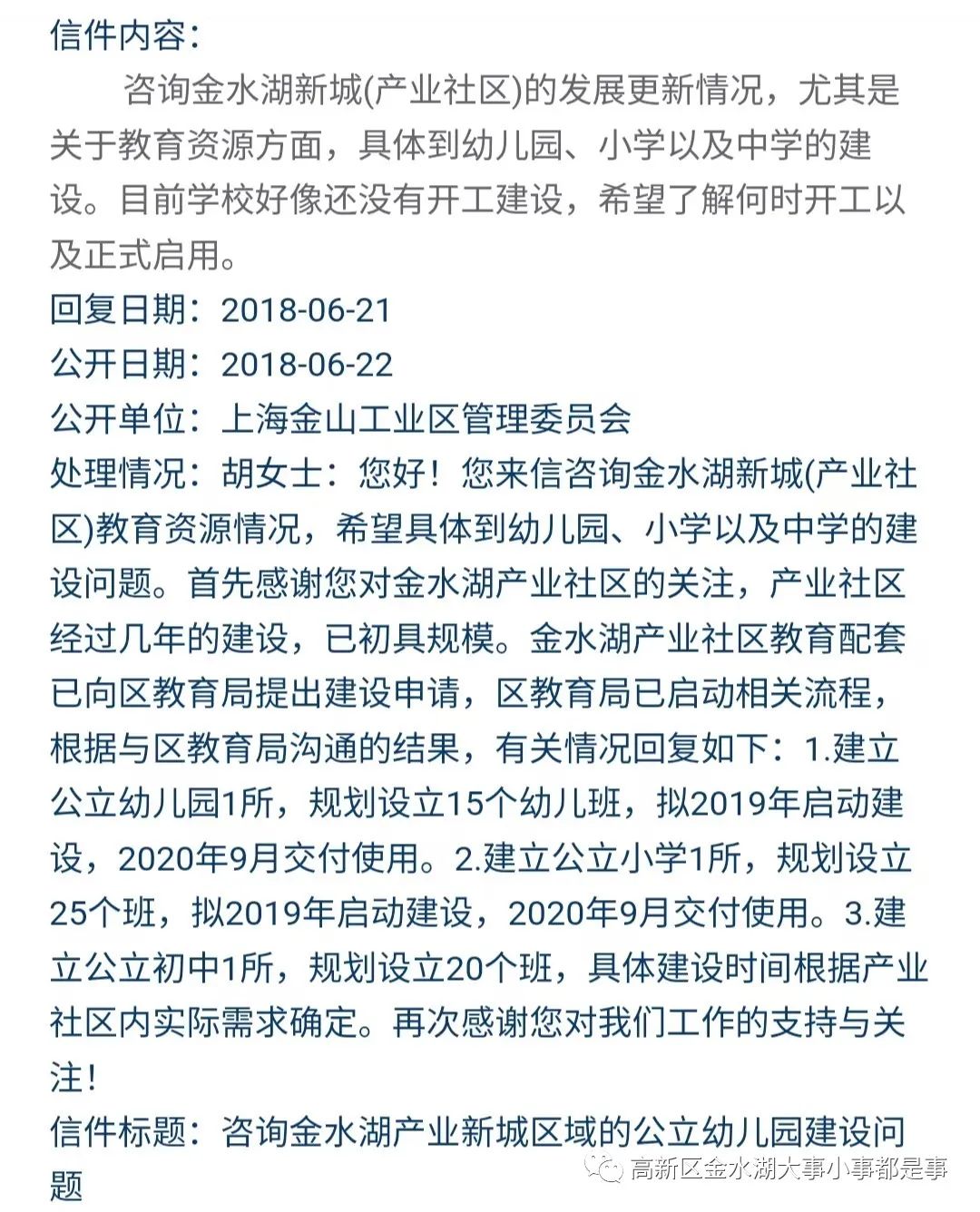 (二)在社区居民对于金水湖教育配套的信访中,有关部门多次表示公立幼儿园、小学和初中将在2019-2020年陆续建成。详情见下图。
