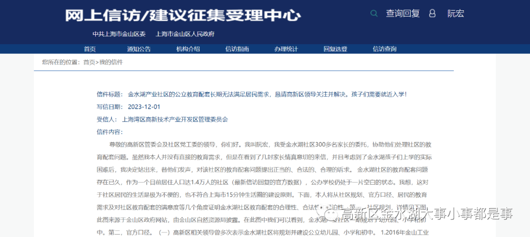 尊敬的高新区管委会及社区党工委的领导,你们好。我叫阮宏,是一名土生土生的朱行本地人。近期,我受金水湖社区300多名家长的委托,协助他们处理社区的教育配套问题。虽然我本人并没有直接的教育需求,但是在看到了几封家长情真意切的来信,并且考虑到了金水湖孩子们上学的实际困难后,我决定站出来,替他们发声,对该社区的教育配套问题提出正当的、合法的、合理的诉求。