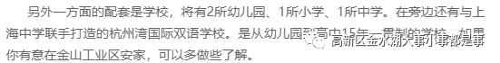 2.2021年,上海新金山工业投资发展有限公司党委书记、董事长沈国忠在接受金山融媒中心街镇(工业区)书记全媒体访谈时曾在回答社区居民来电时表示,在十四五期间,将重点推进秋灵路中学的建设,并考虑和上海市的名校合作,引入更加优质的教学资源,同时,公立的幼儿园和小学也要相继建设,具体建设进程会依据湖畔居民的入住速度来定。