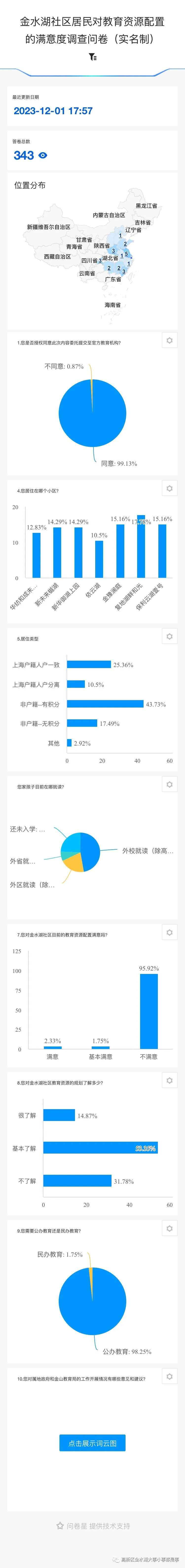 本人也通过问卷星平台做了数据调查。截止到2023年11月29日,共收到335份答卷,数据显示,社区居民对社区教育配套的满意率仅为2.39%,不满意的达到了95.82%。另外,仅有1.79%的居民更需要民办教育。这些扎眼的数据切实地体现了居民们对产业社区教育配套的不满。