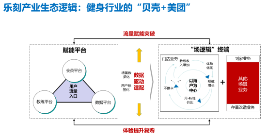 还有一个企业,乐刻运动,是做健身的连锁。是连锁的商业模式吗?其实不是,是通过线下的连锁,还依托线上流量,到上游就会有会员的平台,数据的平台,教练平台。举个简单的例子,假设我们会议,也可以和乐刻联系,课间休息的时候有一个健身教练带着我们跳操,给他一笔费用,他们现在说阿里和华为也是这种合作,就把教练资源做成了资源经营,把人、货、场分离了。