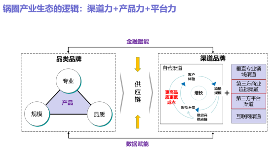 比如锅圈,是做火锅烧烤食材连锁店的,开了超万家门店,马上在港股上市了。原来是下沉市场,以买假货的价格让你买到真品,找到了一个价值定位,迅猛发展。当年听我讲课的时候,还是刚刚开第一家店,就是因为我讲了百果园的案例,他的定位都没变,也是好吃不贵,迅猛发展。其实也是一个道理,就是在前端找到一个价值模式,迅猛发展,形成了流量平台之后再往上游整合。2020年我在上海生态上供应大会的时候,那个时候它还不是特别大,我曾经就讲,跟着锅圈发展的供应商,可能三年之内会发展非常快,几十倍的增长,事实证明也是对的。