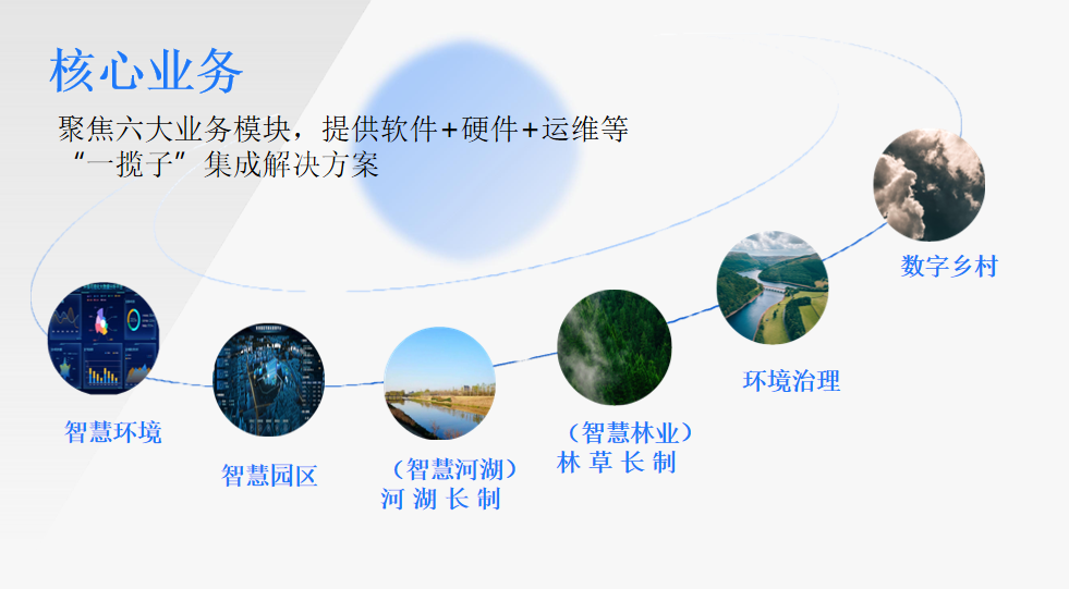 核心业务涉及:智慧环保,智慧水务,智慧林业,智慧园区,智慧双碳,环境监测,环境(水、土、气)综合治理等领域。公司开发了多场景的软件技术应用平台和硬件产品,在资源方面与国内重点大学、科研院所以及知名专家教授深度合作,在生态环境和智慧城市等细分领域,为客户提供“软件+硬件+运维服务”集成服务和“测、管、治”一站式解决方案。