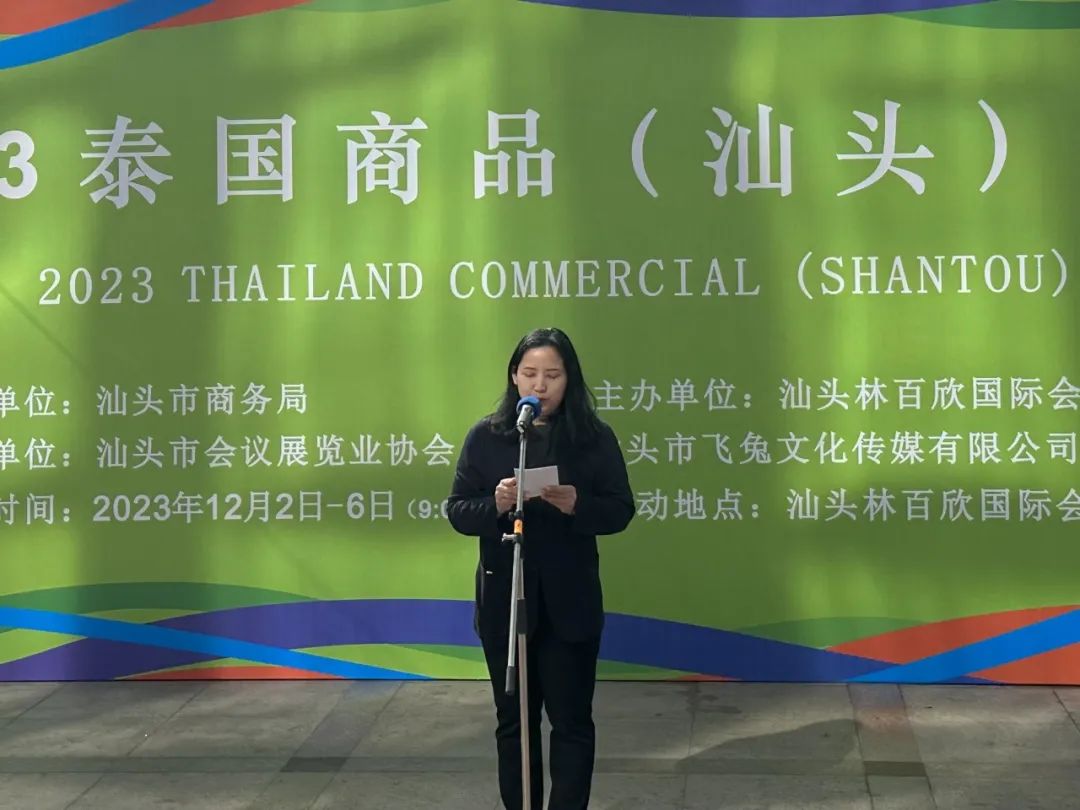 汕头市商务局三级调研员、汕头市会议展览业协会会长周乐宜致辞并宣布展会开幕。她表示,本次交易会是推动中泰命运共同体建设、推动共建“一带一路”高质量发展的具体行动,也是深化中泰经贸合作、汕泰友好合作的重要平台。希望通过这个平台,能够加强汕头与泰国等“一带一路”国家贸易合作和文化交流,实现互惠共赢的目标。希望主办方能不断提升交易会的规模、档次和水平,将交易会打造成为深化中泰以及“一带一路”国家人文交流、开放合作的优质展会品牌。