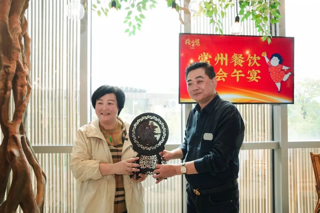 常州市餐饮商会会长贺新页为“猪肉婆品牌”创始人、广东天悦餐饮管理集团董事长吴素芬赠送纪念品。