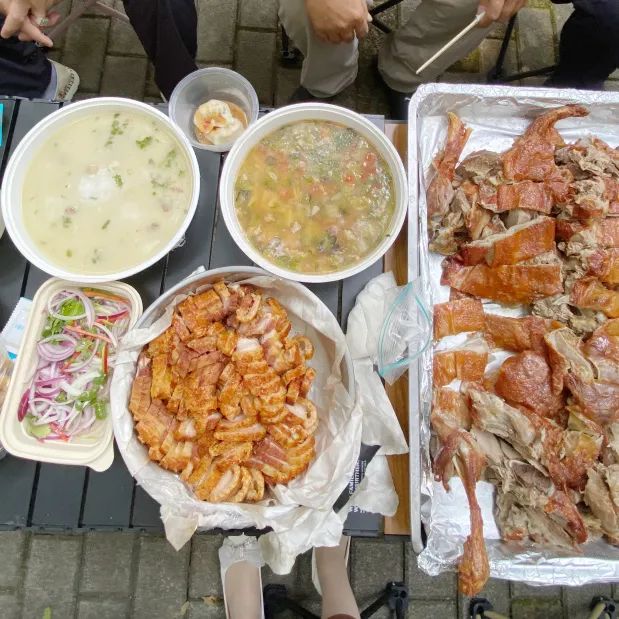 稍作休整,大家分工协作,铺好野餐垫,支起野餐桌,正式开启属于八组的欢乐时光。大家纷纷拿出提前准备好的食材,有家乡的鱼圆子、藕夹、粘米粑、包面、油粑…….还有梅姐亲手做的脆皮猪肉,会长陈爱华为这次野餐活动特意订购的一只烤全羊,各种食材准备得相当充分。