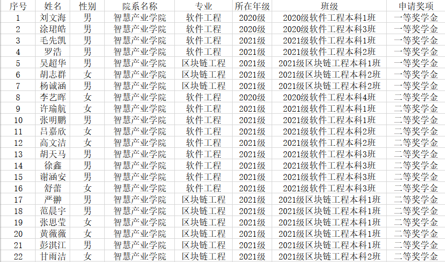为激励普通本科高校、高等职业学校学生勤奋学习、努力进取,在德、智、体、美、劳等方面得到全面发展,江西工程学院设立天工奖学金,用于奖励在道德风尚、社会荣誉、社会实践、学科竞赛或学业成绩等方面特别优秀的学生。智慧产业学院严格按照上级有关文件的精神,结合本院实际,在开展工作前认真部署,经个人申请、班级推荐评选、资格审查以及学院奖助学金评审小组综合评定,综合学生各方面成绩表现,最终在2020级、2021级学生中初步评定拟获2022-2023学年天工奖学金获得者22人:一等奖学金7人、二等奖学金15人。现将智慧产业学院2022-2023学年拟获评天工奖学金名单公示如下:
