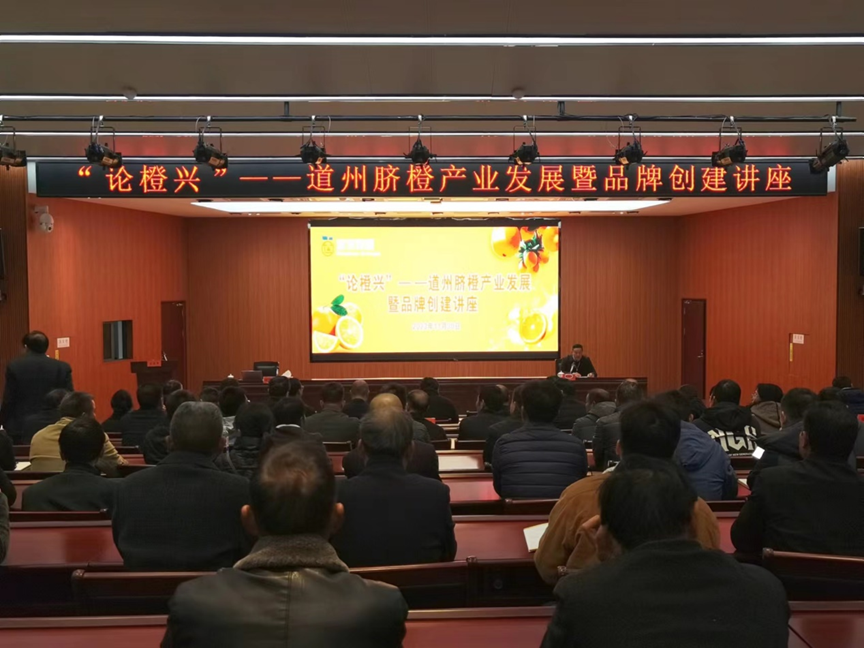 “论橙兴”——道州脐橙产业发展暨品牌创建讲座由湖南省柑橘协会和道县农业农村局共同承办,邀请了农业农村部食品安全中心副主任王子强,农业农村部农业品牌专家工作委员会委员铁丁,中国果品流通协会秘书长陈磊、湖南省园艺研究所研究员李先信和湖南农业大学商学院副教授旷彦昌分别就培育优秀农业品牌、区域公共品牌建设、果业发展现状及趋势、农产品海内外市场开拓和脐橙绿色高效栽培管理进行了专题讲座,讲座由湖南省柑橘协会会长邓子牛教授主持。
