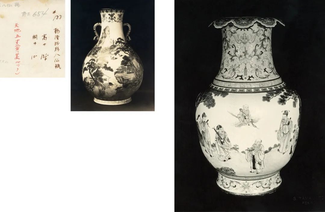 1912年,承恭亲王奕䜣爵位的小恭王溥伟为了筹集复辟经费,将恭恭王府收藏数千件古玩珍品,几乎全部变卖给了山中商会。据溥伟《让国御前会议日记》记载,他把这事对母亲说:“时局至此,后变不堪设想,拟毁家以纾国难。溥伟的母亲当场应允,‘尽出古画古玩,招商变价。”山中商会旧藏恭王府文物照片上,很多都钤盖有英文“S.YAMAMOTO PEKING”字样,我们不难得知:山中商会与恭王府在交易过程中,还曾邀请山本照相馆的职业摄影师专门为这些文物拍照。它们以清康雍乾三代的御窑陈设器为主,其中不乏珐琅彩、洋彩等名贵彩瓷,以及冬青釉、窑变釉等美观的单色釉重器,精彩纷呈。