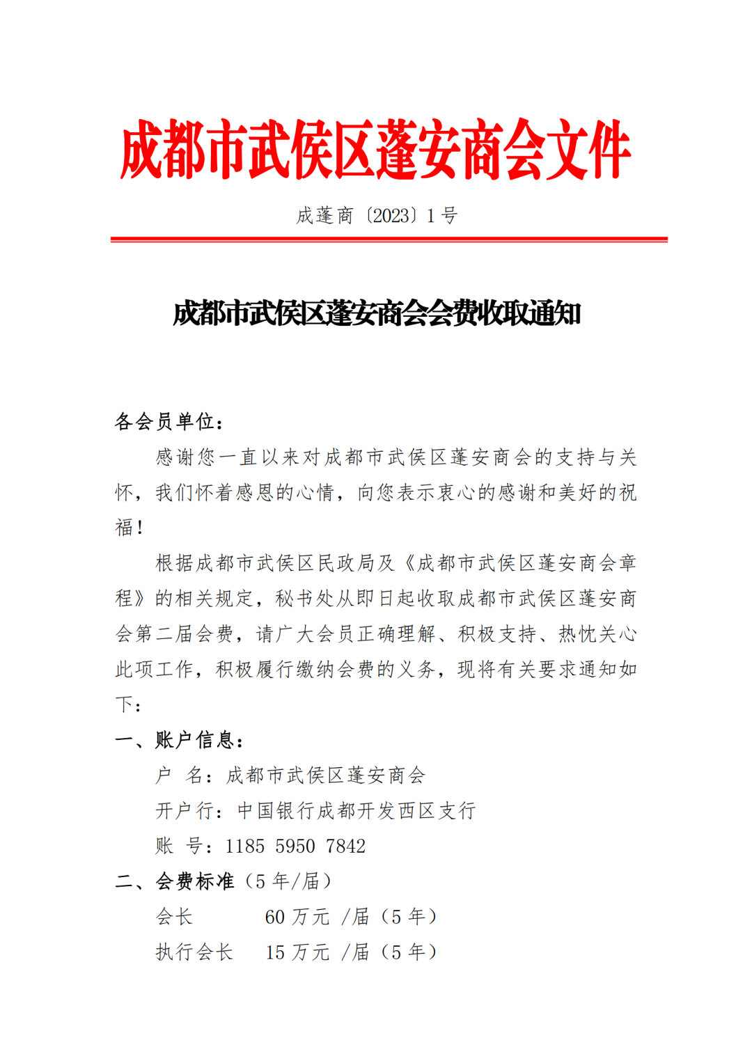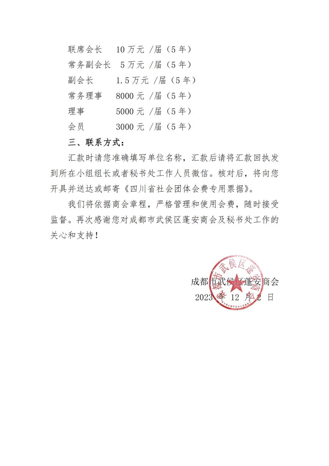 成都市武侯区蓬安商会会费收取通知