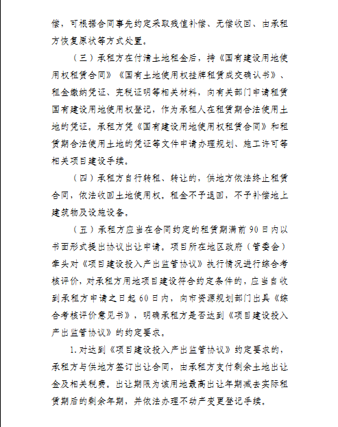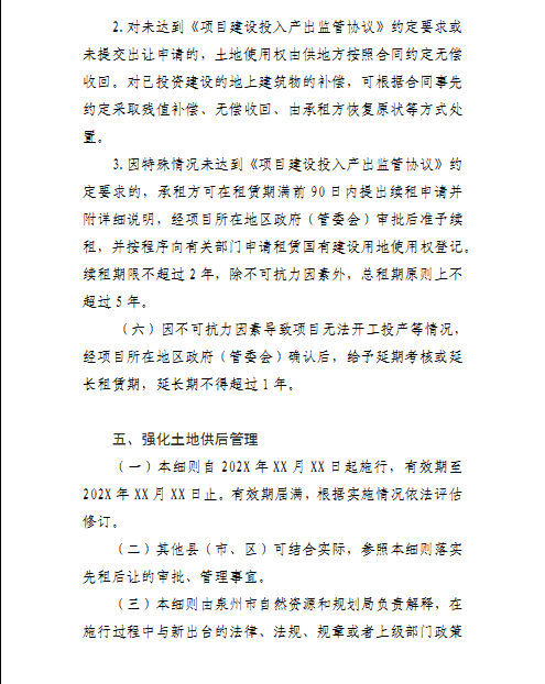 四、土地供后监管。规定了土地供后的监管主体,以及租赁到期后不同情况的处理方式。项目所在地区政府(管委会)为先租后让的土地供后管理的监管主体。各相关部门应对《项目建设投资协议》涉及本部门职责范围事项进行考评。