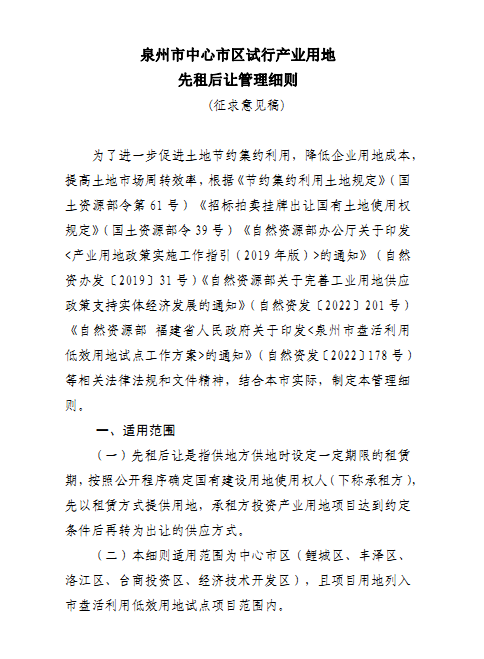 《泉州市中心市区试行产业用地先租后让管理细则(征求意见稿)》意见征集