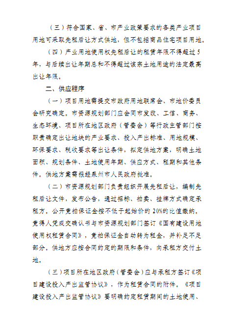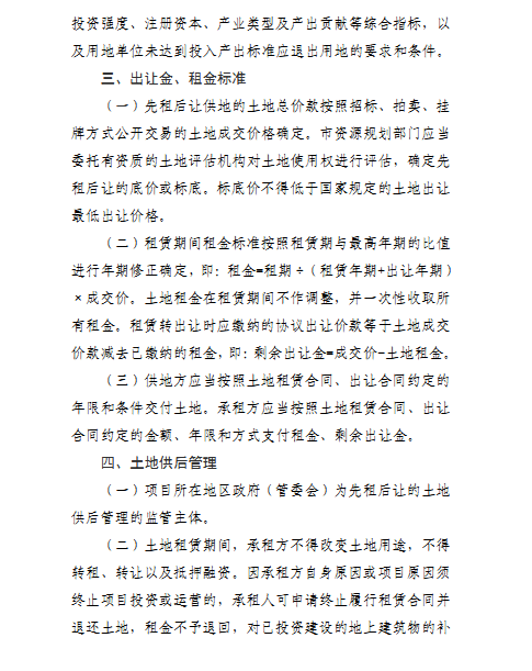二、土地供应。规定了先租后让供应流程及各有关部门的职责分工。市资源规划部门应会同市发改、工信、商务、生态环境、项目所在地区政府(管委会)等行政主管部门共同拟定供地方案,按程序报经市政府研究同意后,组织实施。