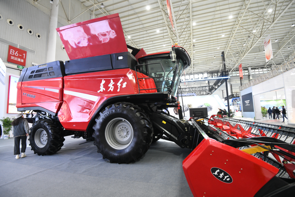 国机集团下属中国一拖集团有限公司带来了我国自主研发的首台大型高效谷物联合收割机;