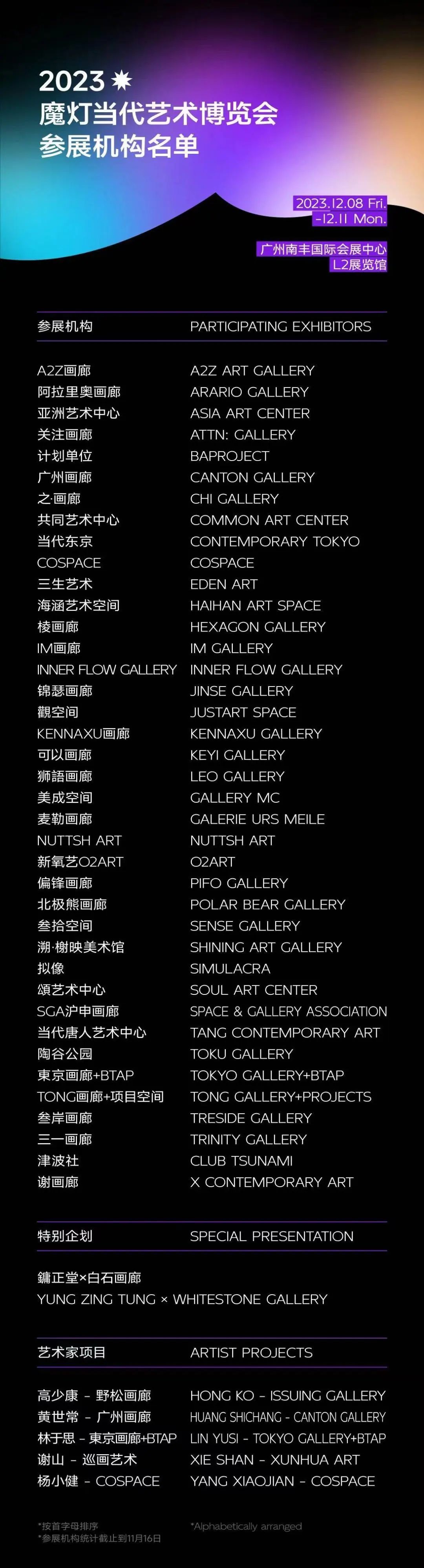 本届「魔灯当代」荟萃了布局于欧洲、日本、韩国、新加坡、香港、北上广深等多个国家及地区的资深机构,同时挖掘扎根于广州、佛山、深圳等粤港澳大湾区先行代表城市的优秀画廊参与。除此以外,本届艺术博览会特别为新锐画廊提供了充满诚意的展现机会,关注并助力优秀当代机构的成长,多维展呈画廊生态的丰富面貌,以此勾勒出「魔灯当代」的差异化思路及图景。