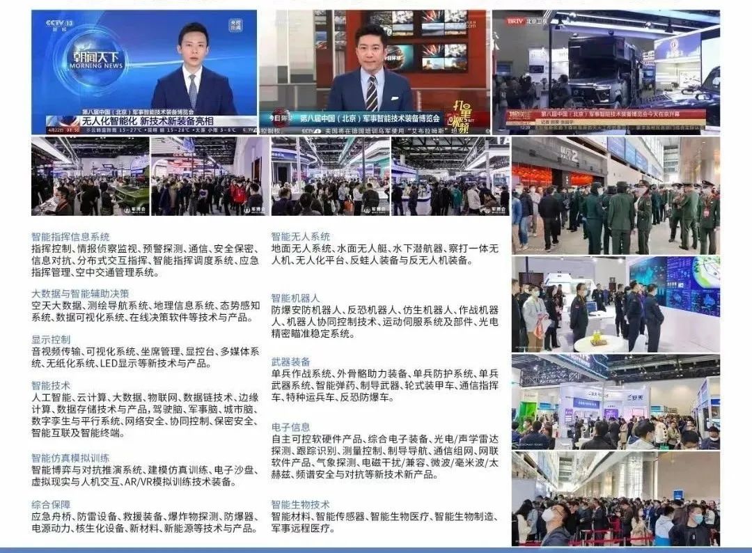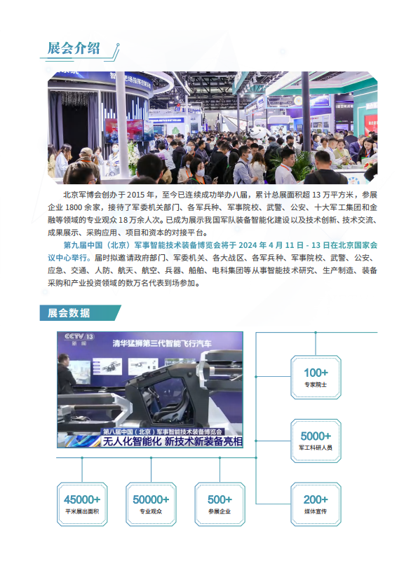 中国指挥控制大会暨北京军博会是由中国指挥与控制学会主办,北京洞见未来会展有限公司承办的军民前沿技术领域综合性大型学术交流和科技成果展示活动。从2015年开始,至今已连续成功举办八届,累计展览面积近13万平方米,参展企业1800多家,参观人数18万余人次,中国指挥控制大会暨第九届北京军博会将于2024年5月17日-19日在北京国家会议中心举行,展览面积45000平米。届时将邀请政府、军队、武警、公安、交通、人防、航天、航空、兵器、船舶、电科集团等从事军民技术与产业领域的50000多名代表到场参加。