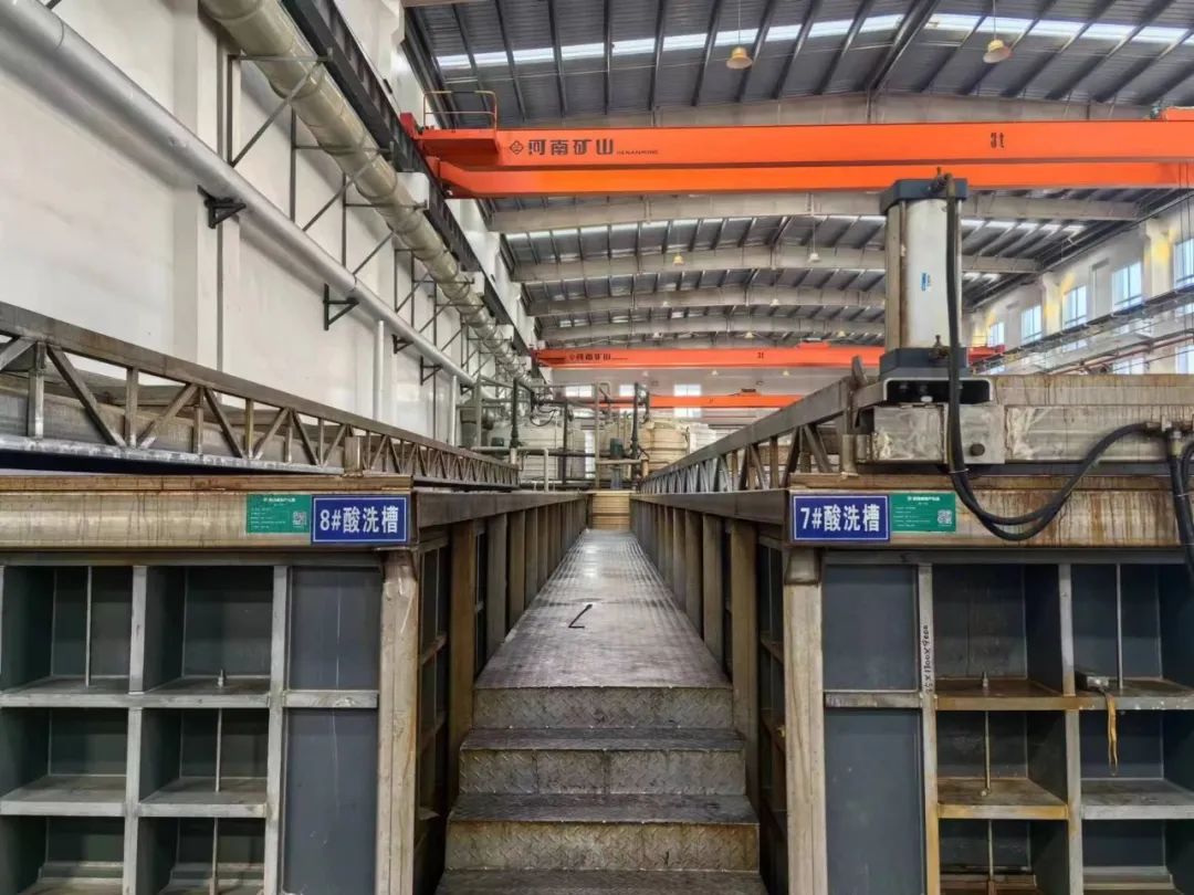 6#车间是酸洗车间。崔主管介绍,6#车间有北跨、中跨、南跨三个区域,包含酸洗区、去油、白化区、污水废气处理区。酸洗也就是将管子放在硝酸、氢氟酸、水的混合液体里浸泡,通过化学反应来清除表面的氧化皮、锈蚀物。我们看到工人用行车将一捆捆管子吊起来,缓缓地放到酸洗槽里。在“三废”处理区域,两排高大的罐体一字排列,传出机器的响声,罐体上标有“废水处理罐”、“废气处理罐”的字样。在南跨区域,则是几排长形的水槽,水槽上标有1#、2#“白化槽”、“清水槽”、“去油槽”的字样。