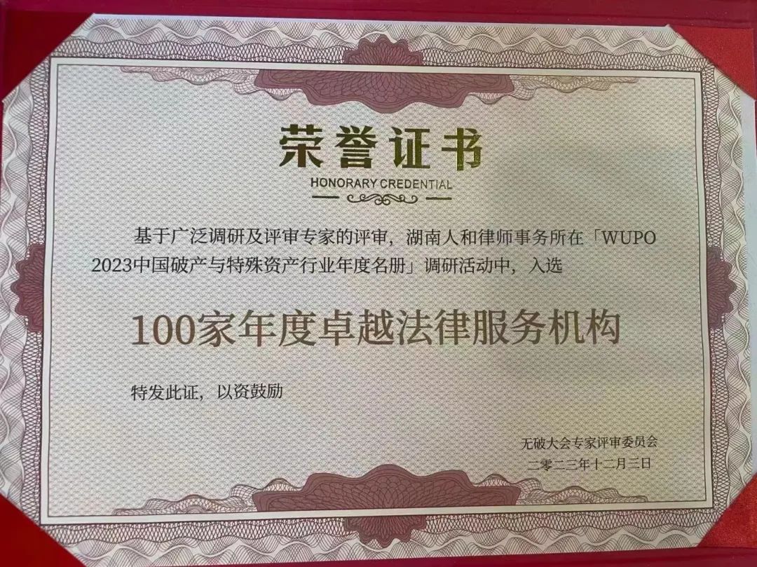 本次大会发布了《 WUPO 2023中国破产与特殊资产行业年度名册》,对过去一年破产与特殊资产行业举行了总结与回顾,并对先进单位、个人及案例等进行了表彰。会员何华单位湖南人和律师事务所获评“100家年度卓越法律服务机构”,律所团队案例获评“典型案例”。