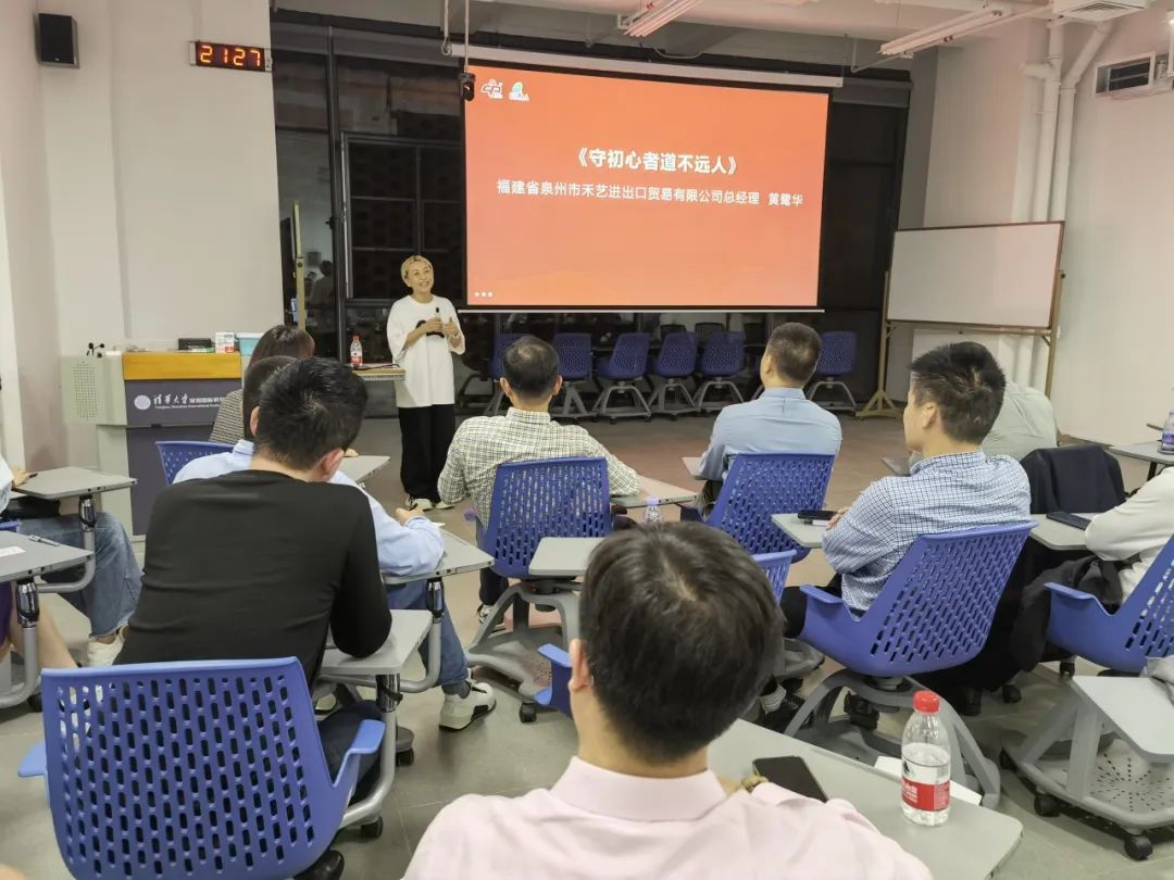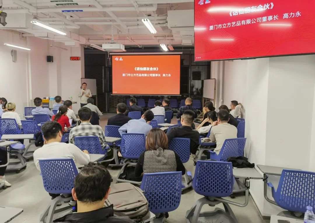 在清华电教楼召开的第一场团员分享会上,厦门市立方艺品有限公司董事长高力永、福建省泉州市禾艺进出口贸易有限公司总经理黄鹭华分别做了《话仙朋友合伙》和《守初心者道不远人》的主题分享。