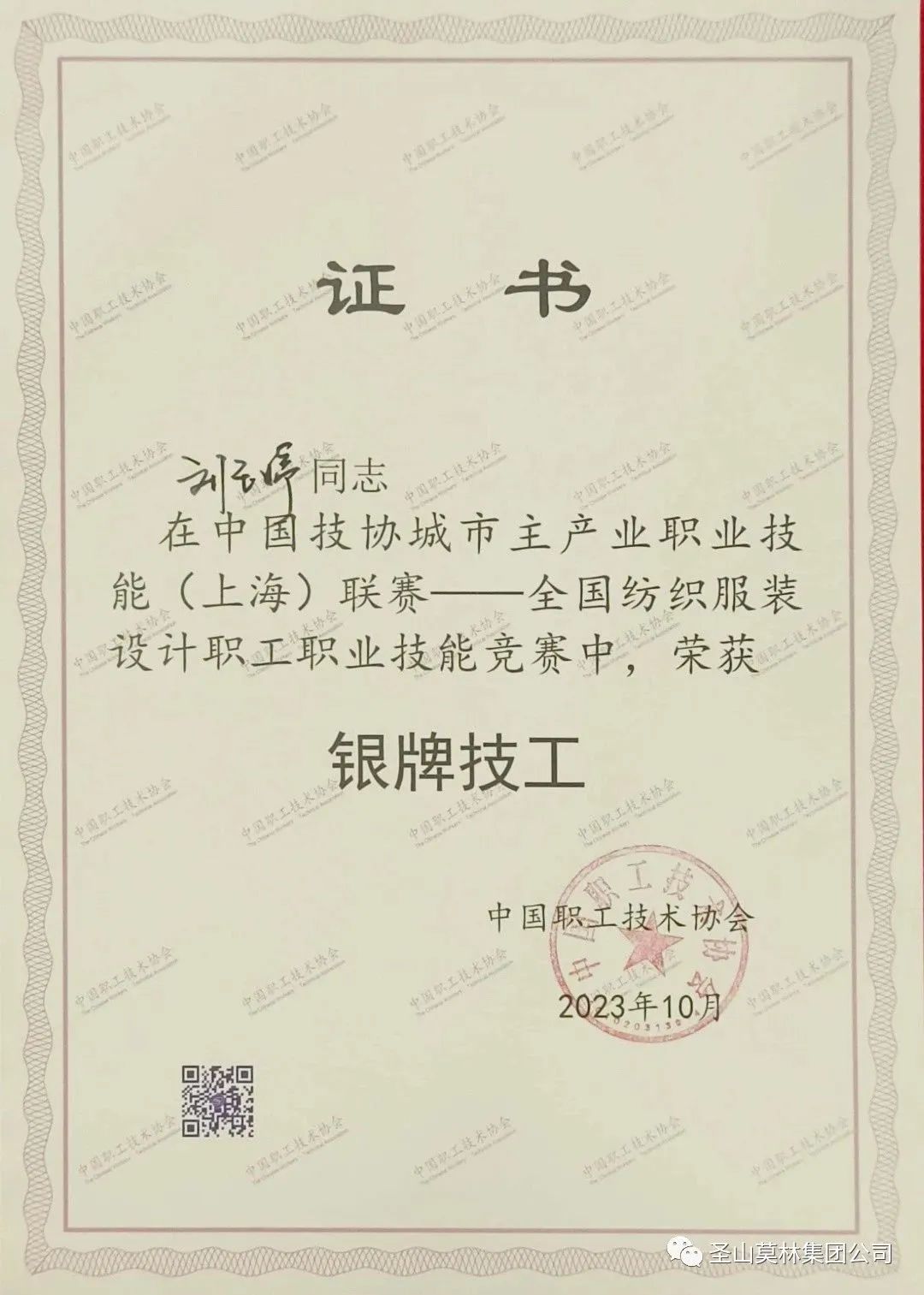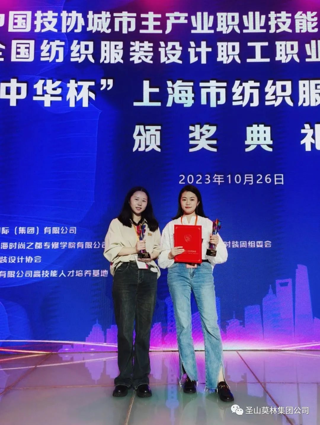 近日,中国技协城市主产业职业技能(上海)联赛——全国纺织服装设计职工职业技能竞赛及颁奖典礼在上海国际时尚中心举办。四川圣山白玉兰实业有限公司刘玉婷设计作品《無解》获得二等奖,并被中国职工技术协会授予“银牌技工”荣誉称号,熊冬梅设计作品《山月记》获得三等奖。
