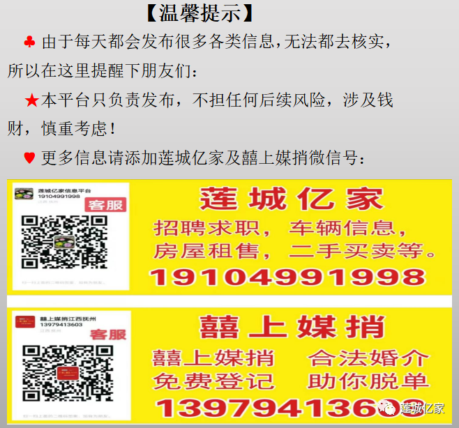 【温馨提示】 由于每天都会发布很多各类信息,无法都去核实,所以在这里提醒下朋友们:本平台只负责发布,不担任何后续风险,涉及钱财,慎重考虑!