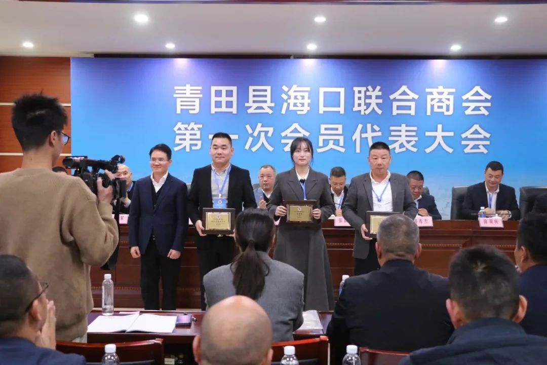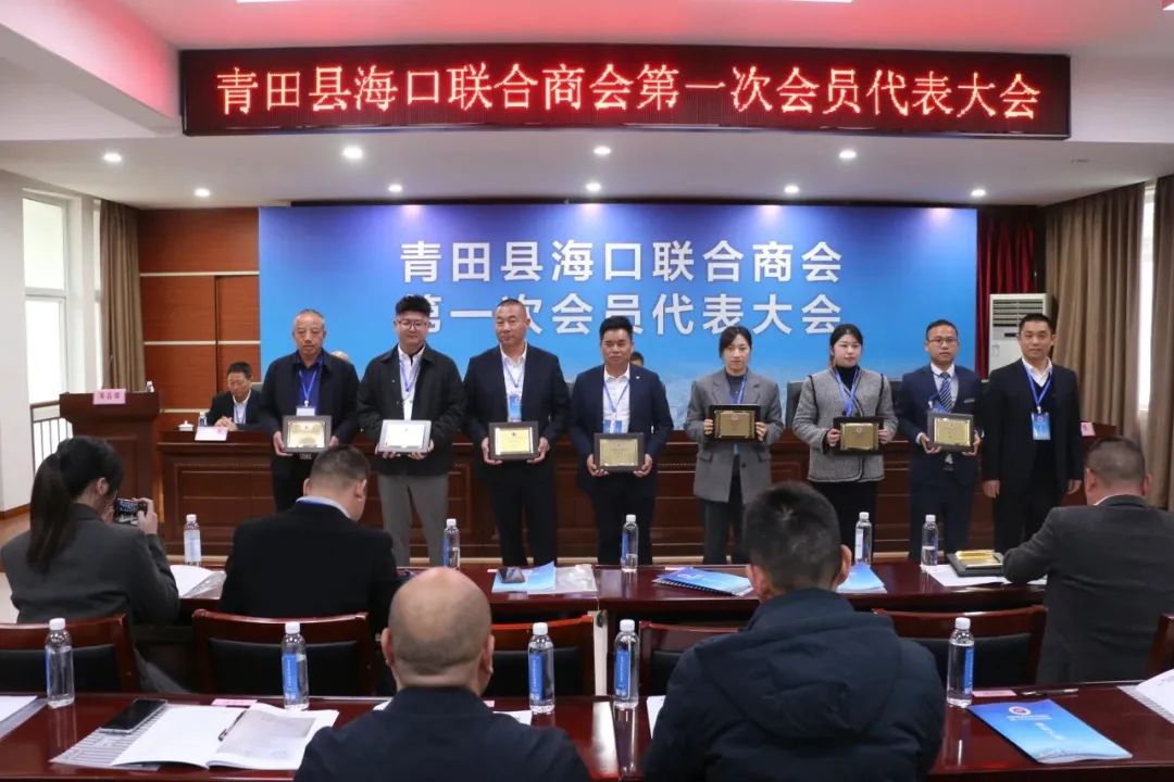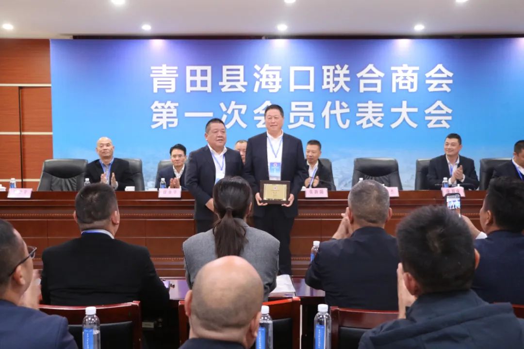 会议报告了青田县海口联合商会筹备情况,宣读了《关于准予成立社会团体决定书》,审议并通过《青回县海口联合商会章程(草案)》,选举产生青田县海口联合商会第一届理事会会长、常务副会长、副会长、秘书长和监事会监事长,青田三合工贸有限公司董事长黄崇平当选首届会长。海口镇乡贤联谊会会长蔡美华代表社团向海口联合商会致贺词。