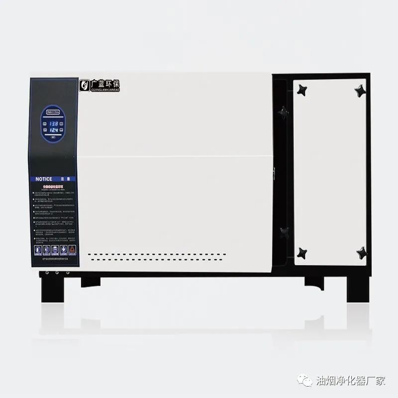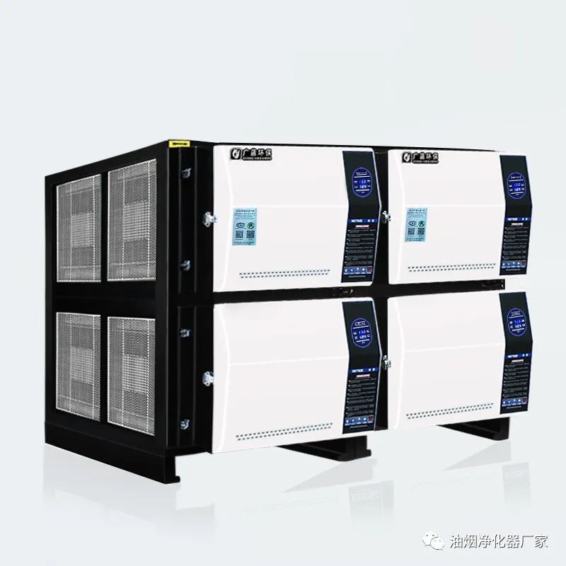除烟除味油烟净化器工作原理主要涉及到三个部分:油烟净化、UV光解和活性炭吸附。首先,油烟由风机吸入油烟净化器,经过高压电场的作用,油烟气体被电离成带正电荷的粒子,这些粒子被吸附到极板上,剩余的微小油粒在吸附电场的电场力及气流作用下被收集在极板,自身重力作用流到集油盘然后排出。接下来利用UV紫外线光束及臭氧对油烟分子进行光解氧化反应,最终将油烟废气转化成水&二氧化碳,同时烟道中的异味也随之消除。最后一步是活性炭吸附,这一步主要是对剩下的异味进行处理。活性炭有着极大的比表面积和丰富的孔隙结构,这使得它能够有效地吸附空气中的有害物质,如甲醛、苯等,从而达到除味的效果。设备内部使用自主研发高频电源控制系统保证了油烟净化设备的净化效率稳定、低耗能、运行安全可靠。此系列设备采用最先进的梯度单元概念,整体电场设计,解决了传统设备清洗繁琐,维护耗时长等问题。