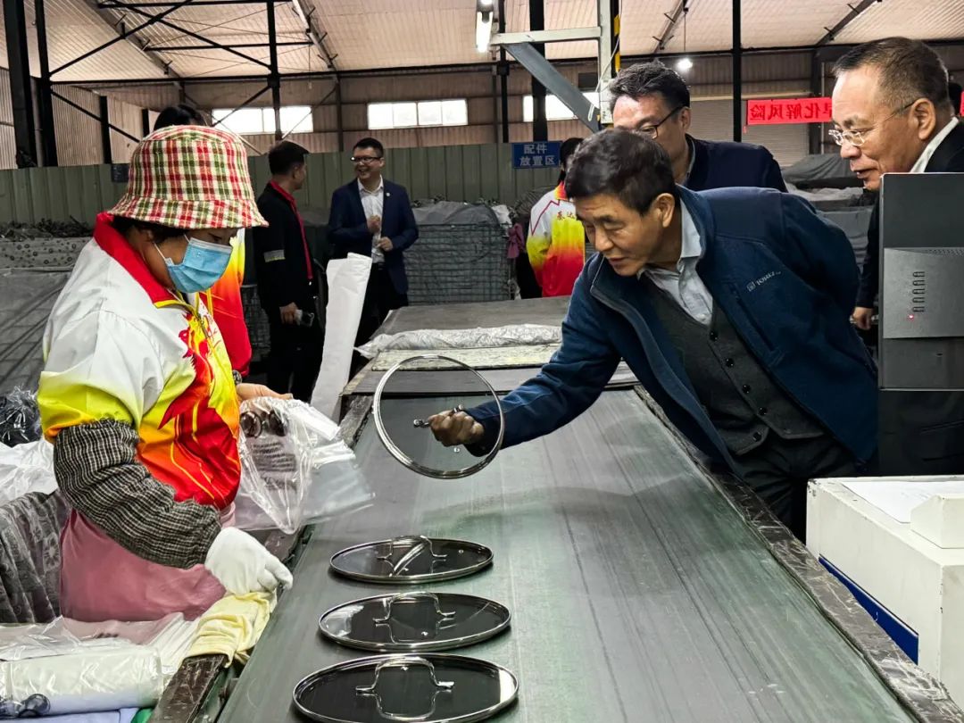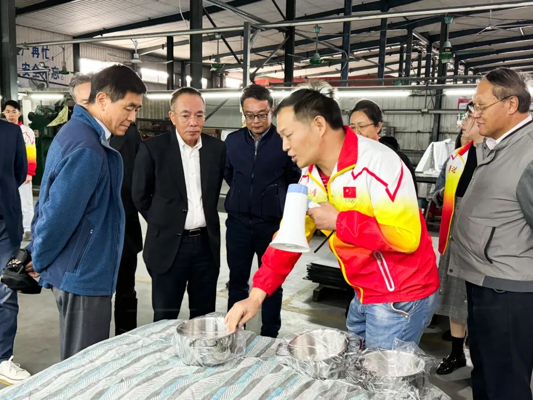 考察团一行来到江门市基达不锈钢制品有限公司(下称基达),在负责人的带领下走进生产车间,近距离观看车间设备生产过程,了解不锈钢制品生产原材料准备、材料裁剪、冲压、抛光等生产工艺,负责人介绍公司发展历程、业务布局以及经营状况,考察团全方位了解企业的规模实力并就近年来不锈钢制品出口状况进行交流。