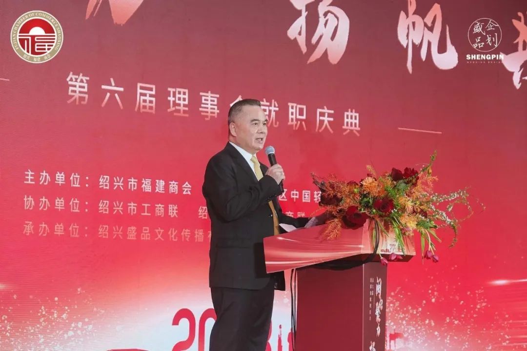 施⼈玮会⻓代表商会致贺词。他说,千百年来,⽆数中外⼈⼠对绍兴向往,积淀起⼀座城市的⽆形引⼒。我们闽商⾃古以来敢为⼈先、爱拼会赢,在绍兴这块魅⼒之地激发出了蓬勃发展的潜⼒与活⼒。绍兴市福建商会,多年来秉持“联谊、进取、和谐、共勉”的办会宗旨,积极为会员服务,为政府服务,为社会服务,为闽绍两地经济社会发展做出了突出的贡献。相信新⼀届理监事会在施⽂国会⻓的率领下,必将激发在绍闽商合作共赢 的更⼤能量,勇⽴潮头,砥砺前⾏,努⼒书写事业发展新篇章!衷⼼祝愿绍兴市福建商会奋楫扬帆,勇毅前行,再创商会事业新辉煌!