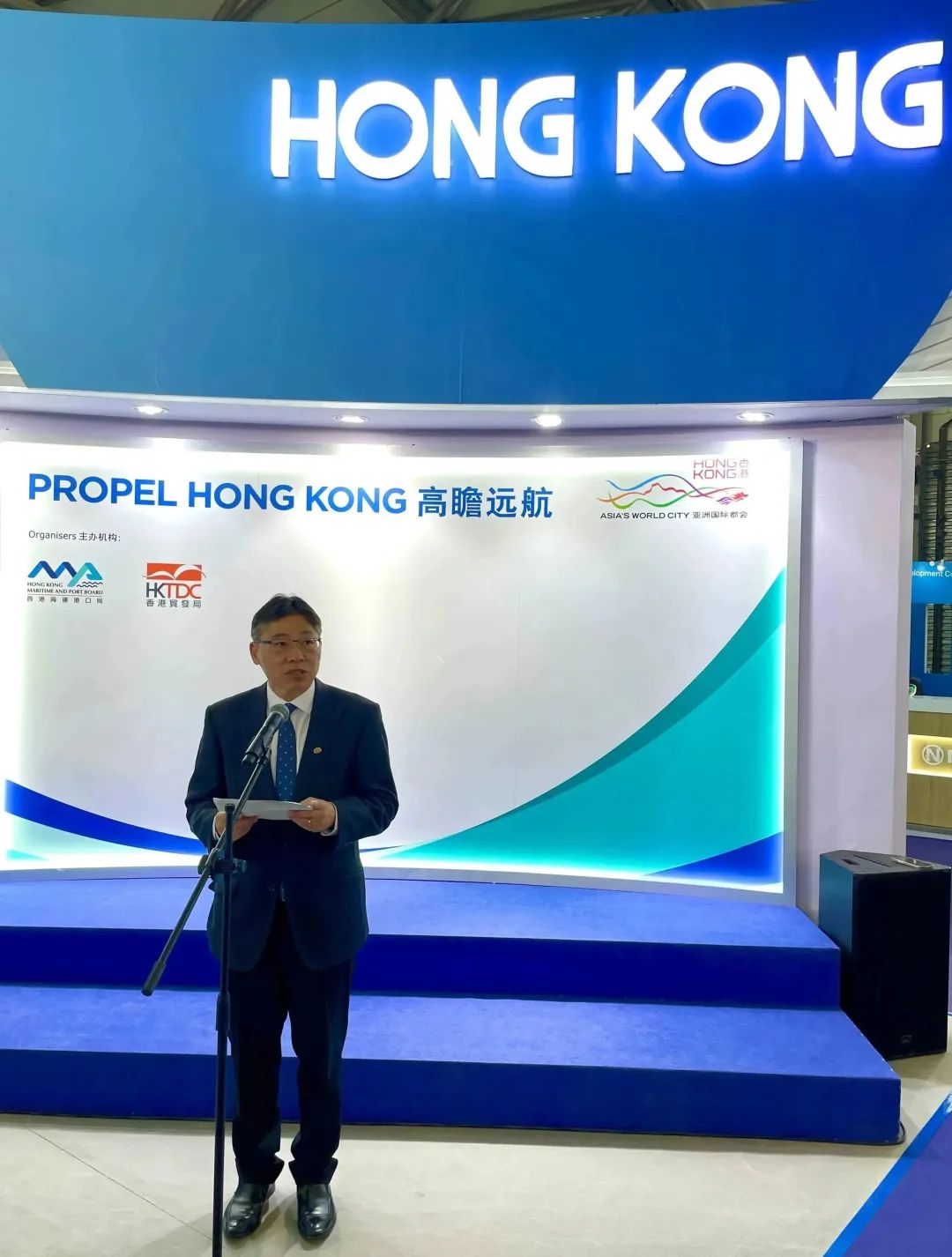 中国香港馆阔别上海四年,他感谢国家工业和信息化部副部长辛国斌到访,以及香港贸易发展局、海事处以及香港参展商的支持,在中国国际海事技术学术会议和展览会说好香港故事。