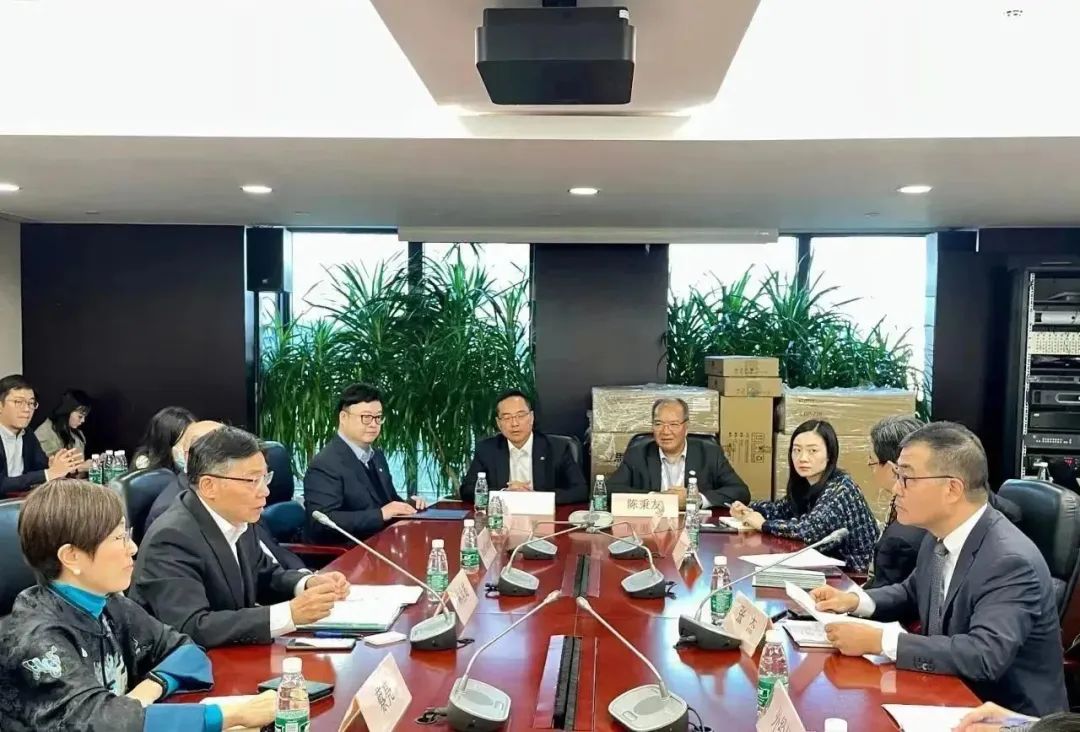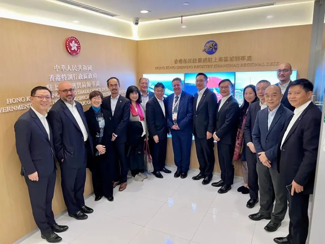 林世雄 (左七)在驻沪办主任蔡亮(左三)陪同下,与香港海运港口局成员到访香港船舶注册处驻上海区域办事处,了解办事处成立四年的工作。