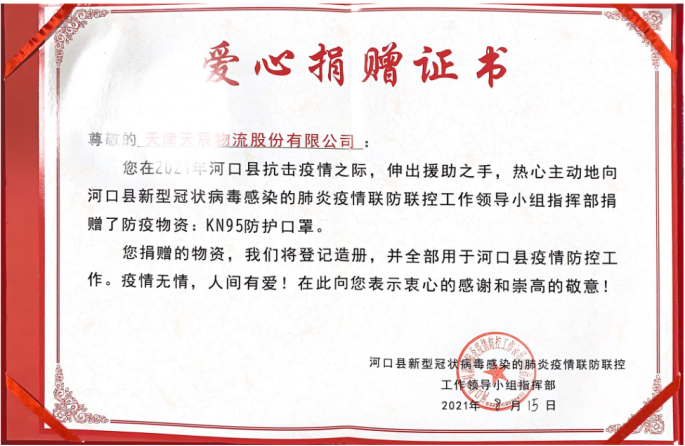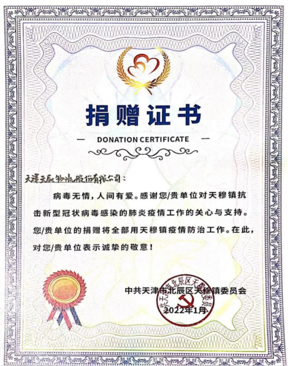 2020年初新冠疫情开始,为满足客户生产口罩原料及无纺布配送需求,组织企业员工加班加点连续奋战在一线,为抗击疫情救助物资的运输争取了宝贵时间。在2020年一季度内企业就累计帮助政府及各部门完成23次防疫物资运输任务,获天津市北辰区疫情防控工作指挥部授予荣誉证书;2022年9月在疫情期间为响应北辰区政府对口帮扶甘肃省华池县的号召,企业捐款10000元;2022年2月向天津市北辰区天穆镇捐赠价值10350元的抗疫物品;2022年5月为市、区合作交流办承担天津市支援西藏自治区昌都市防疫物资运输任务,顺利保障物资及时到达昌都市;2022年10月为天津市北辰区天穆小学传统花毽项目捐款3000元。