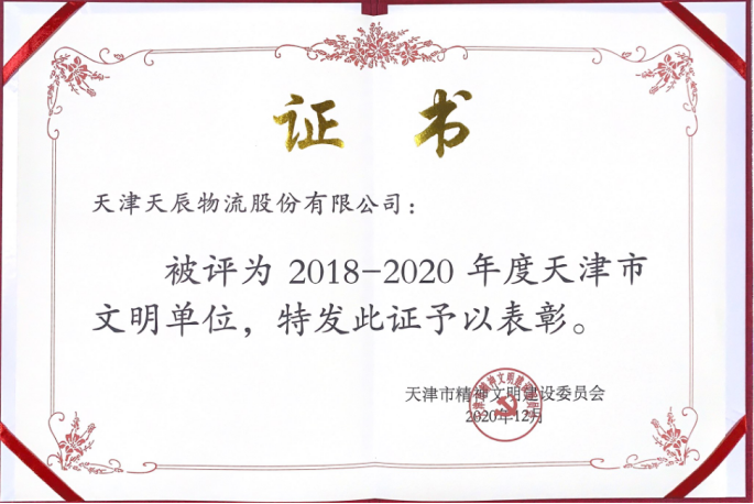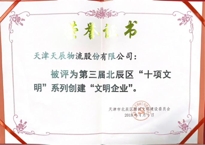 企业经过多年脚踏实地的奋斗,长期坚持诚信守法服务社会的经营准则,获得政府和社会的一致好评,被天津市市场监督管理委员会连续两届评为天津市“守合同重信用”企业,被北辰区交通安全委员会评为“交通安全先进单位”,被天津市民族和宗教事务委员会评为“天津市民族团结进步创建示范单位”,被北辰区精神文明建设委员会评为第三届北辰区“十项文明”系列创建“文明企业”,被天津市评为“天津市文明企业”。企业负责人穆怀永先生获得“全国物流行业劳动模范”称号,被北辰区精神文明建设委员会评为第十四届“感动北辰文明人”,并在2018年6月11日受邀走进人民网,参与了《奋斗者说》栏目,讲述了天辰物流在物流行业的创业经历。