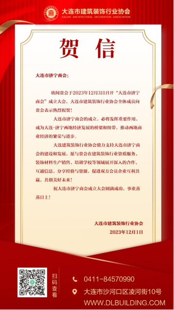 最后大连市建筑装饰行业协会热烈祝贺大连市济宁商会成立,大连市济宁商会的成立为济宁籍企业家搭建了一个凝聚乡情,共叙友谊,共谋发展的交流平台,也希望大连市建筑装饰行业协会与大连市济宁商会建立起更加紧密的联系与合作,增进友谊,相互融合,共同探索更多的合作机会和发展空间,共谋商会发展之路。