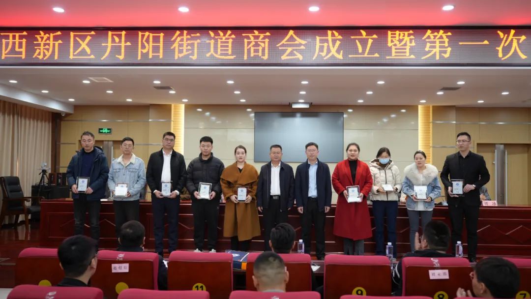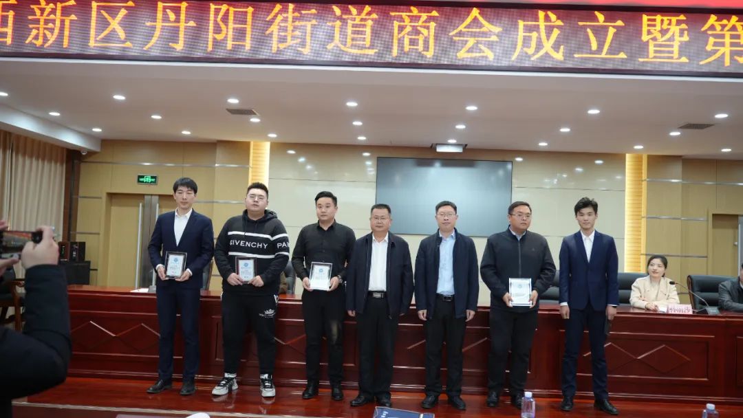 第二阶段召开成立大会,马金生、焦广舟为丹阳办事处商会党支部揭牌,刘冰、刘世豪为丹阳办事处商会揭牌,与会领导为新当选的领导班子成员授牌。
