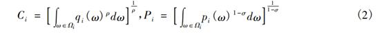 在每个行业i内部,消费者对不同商品ω的偏好满足CES形式的效用函数,即在每个行业i上的消费指数Ci和价格指数Pi分别为: