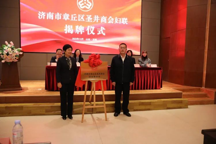 章丘区妇联党组书记、主席侯春红,章丘区圣井街道党工委副书记、办事处主任徐晓麟共同为圣井商会妇联揭牌。