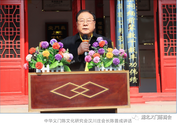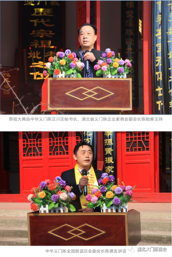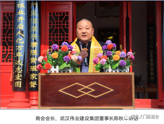 首先我代表湖北义门陈企业家商会对汉川庄的先祖表示崇高的敬意! 对这次祭祖大典的举办表示热烈的祝贺!“九重天上旌耆贵,千古人周羲字香。”为打造湖北省义门陈商界精英交流的平台,把义门陈企业有机结合,集聚力量,拉长产业链,做大产业群,形成群体优势,发挥团队效应,充分整合资源,促使义门陈企业、商业健康、快速、持续发展,更好地传承义门精神,弘扬义门文化! 在江西省德安县委、县政府的高度重视下,在德安县工商联的指导下湖北省义门商会于 2019 年成立。四年来商会坚守“正言正行正能量,共赢共享共辉煌”的初心,发挥重要的平台作用让湖北义门精英抱团发展,做大做强。借此机会也诚挚邀请义门陈有德行,有修为,有爱心,有担当,有实力,有能力的企业家加入商会!为义门辉煌共同努力!
