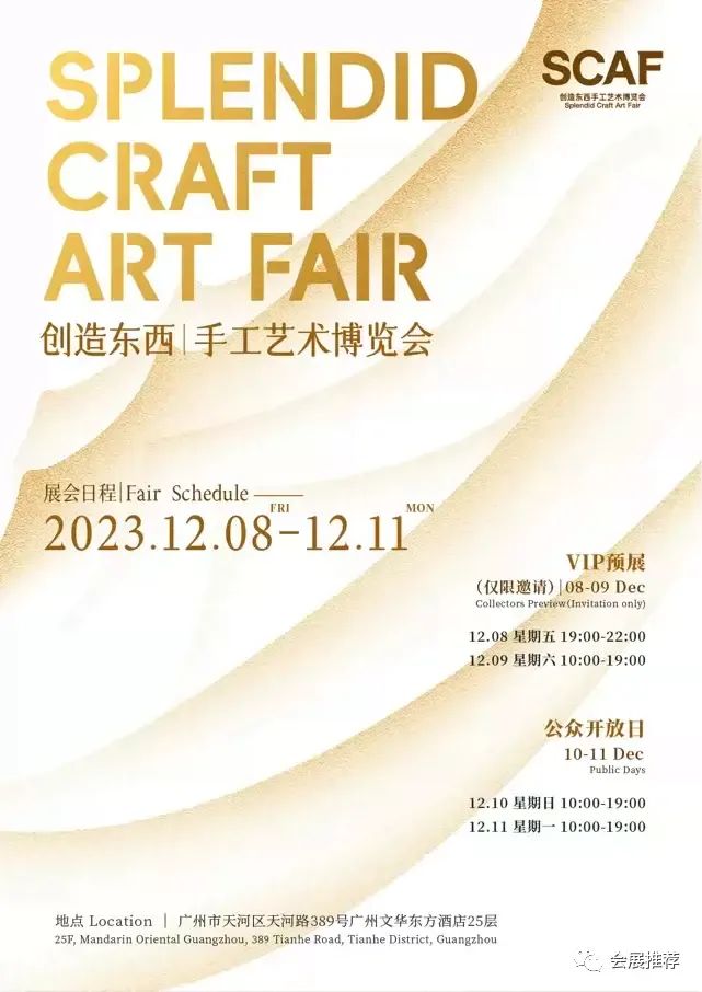 中国首届创造东西手工艺术博览会 Splendid Craft Art Fair (SCAF)——是中国唯一聚焦当代手工艺术的博览会,旨在为当代手工艺术家、画廊机构、藏家及艺术爱好者提供一个国际化的专业交流平台;与传统工艺美术、非遗等不同,SCAF强调传统手工艺术的当代化转换,传承匠人精神,通过创新的艺术探索与跨文化交流,赋予传统手工技艺与材料在当代文化框架下的新生命;SCAF将艺术融入日常生活,倡导新的美学生活方式,彰显独特品味,提升生活品质和幸福感。