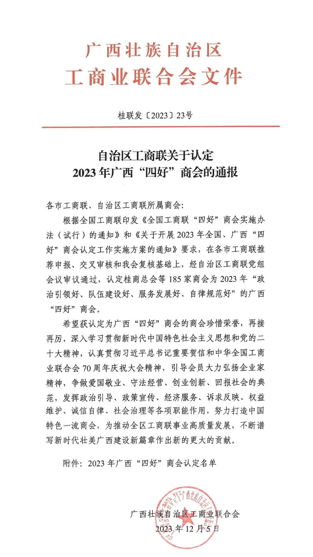 近日,广西壮族自治区工商业联合会发布《自治区工商联关于认定2023年广西“四好”商会的通报》,广西新桂商商会获认定为2023年广西“四好”商会!此次获评也是商会第四次被评为广西“四好”商会。