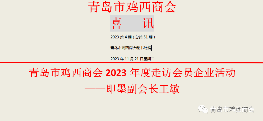 为进一步加强青岛市鸡西商会会员企业间的交流沟通,深入了解会员企业的发展状况,更好地服务会员企业;11月21日上午10点,青岛市鸡西商会会长赵绪民、驻会会长王德革、党支部书记刘敏、监事长毛成利、秘书长孙信德等共同来到即墨区长江家居三楼百特办公家具进行走访,