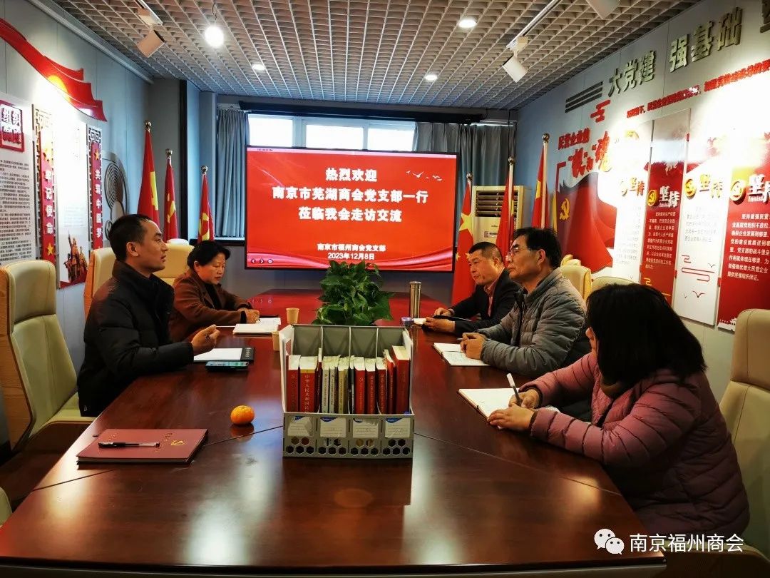 2023年12月8日,我会友好商会——南京市芜湖商会党支部代表蒋寅珠及安徽大别山乡村振兴产业发展有限公司代表梁猛猛来访商会,我会党支部书记兼秘书长叶光明,副书记王玲,常务副会长陈光华(党员)参与接待。