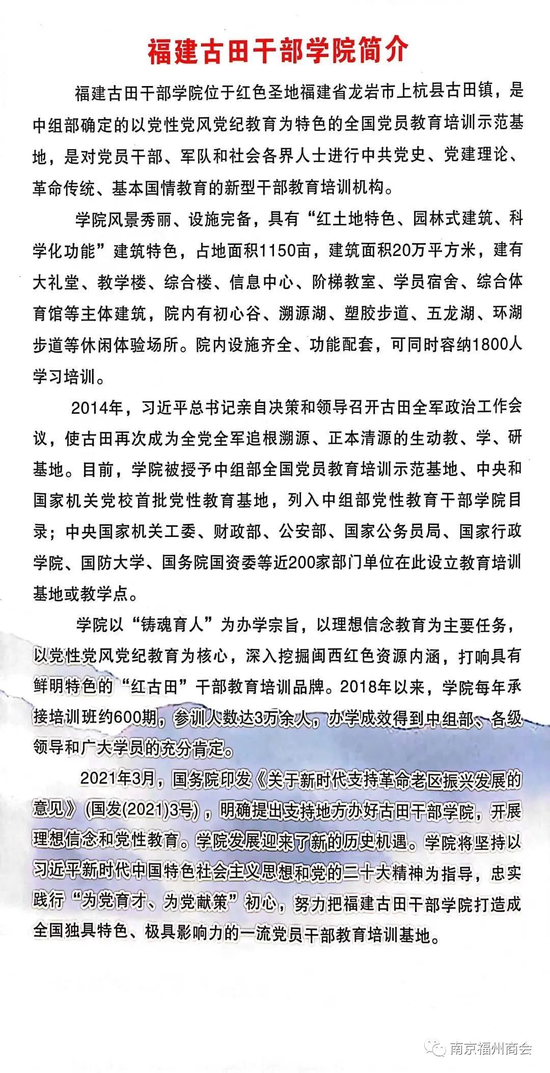 交流会上,学院副院长介绍了古田干部学院办学情况。据了解,学院位于红色圣地福建省龙岩市上杭县古田镇,是中组部确定的以党性党风党纪教育为特色的全国党员教育培训示范基地。学院坚持以习近平新时代中国特色社会主义思想和党的二十大精神为指导,忠实践行“为党育才、为党献策”初心,努力把福建古田干部学院打造成全国独具特色、极具影响力的一流党员干部教育培训基地。